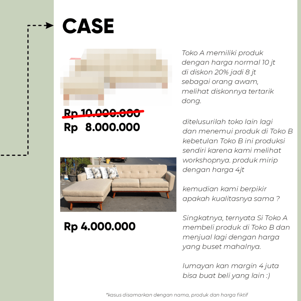 Dalam kesimpulannya, harga yang tinggi bisa disebabkan oleh rantai distribusi yang panjang dan keberadaan banyak tengkulak. Namun, Anda dapat mengatasi masalah ini dengan membeli langsung dari pengerajin atau produsen furnitur. Dengan cara ini, Anda tidak hanya mendapatkan furnitur berkualitas dengan harga yang lebih terjangkau, tetapi juga berkontribusi dalam memajukan industri furnitur lokal. Jadi, saat mencari furnitur baru, pertimbangkanlah untuk membeli langsung dari pengerajin dan nikmati furnitur impian Anda tanpa perlu merogoh kocek terlalu dalam.